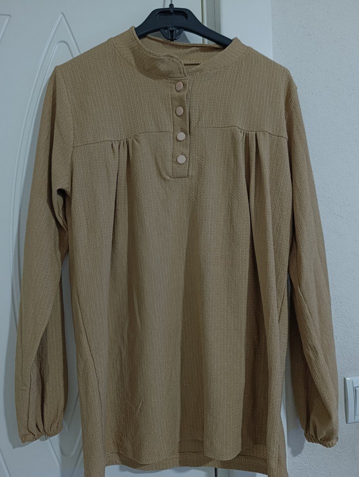 Bej keten kumaştan, düğmeli, uzun kollu, yuvarlak yakalı, bol kesim ve normal boyda bluz. Günlük bohem tarz için uygundur.