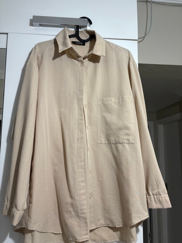 Bej Düğmeli Keten Uzun Kollu Gömlek