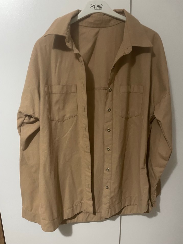 Bej keten kumaştan, uzun kollu ve düğmeli, yakası açık kadın gömlek. Salaş kesimiyle günlük rahat kullanım için uygundur. ✨ hiç giyilmedi etiketi yok 40 42 bedene uyumludur