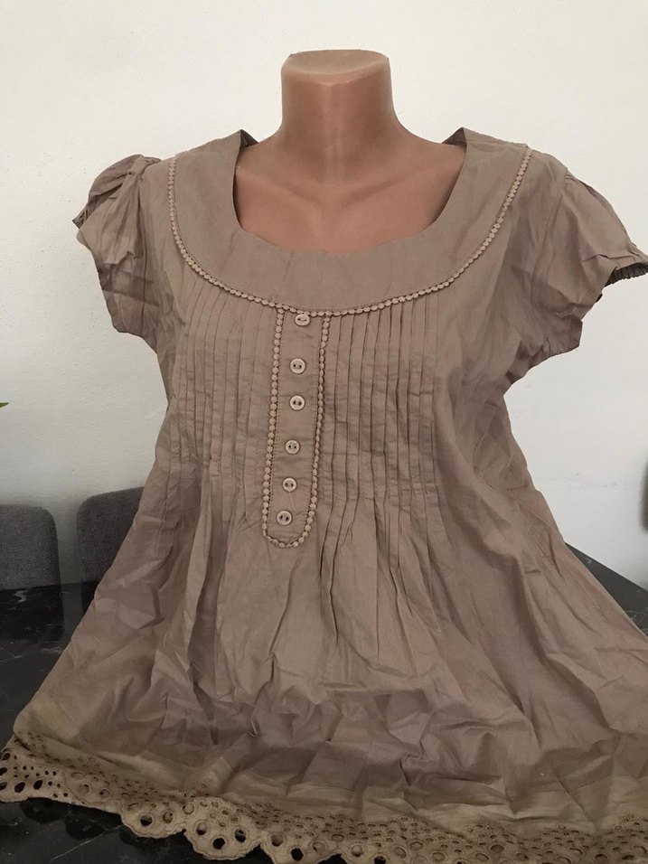Bej keten kumaştan, düğmeli, kısa kollu ve geniş kesime sahip vintage tarzda bir bluz. Boğaz kısmı tekne yakalı, etek ucu dantel detaylıdır.