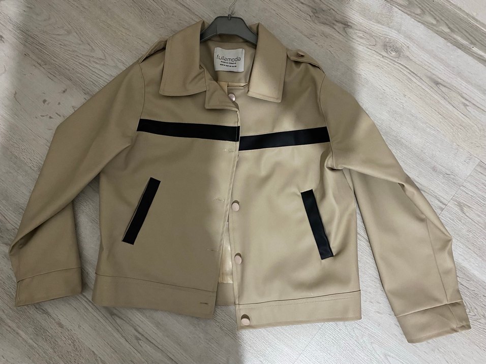 Bej deri ceket, düğmeli ön, kesimli yakalı ve uzun kolludur. Siyah baskılı çizgi. Sorunsuz ürün.
