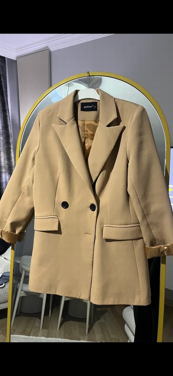 Bej renkte, düğmeli ve kısa kesim kadın blazer ceket. Uzun kollu, parlak sentetik kumaştan, ofis ve günlük kullanıma uygun şık tasarım.