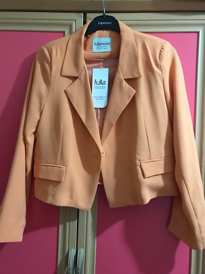 Bej renkli, düğmeli kısa kadın blazer ceket. Uzun kollu, kesimli yakalı ve ipeksi kumaştan üretilmiştir. Ofis ve günlük kullanıma uygundur.
