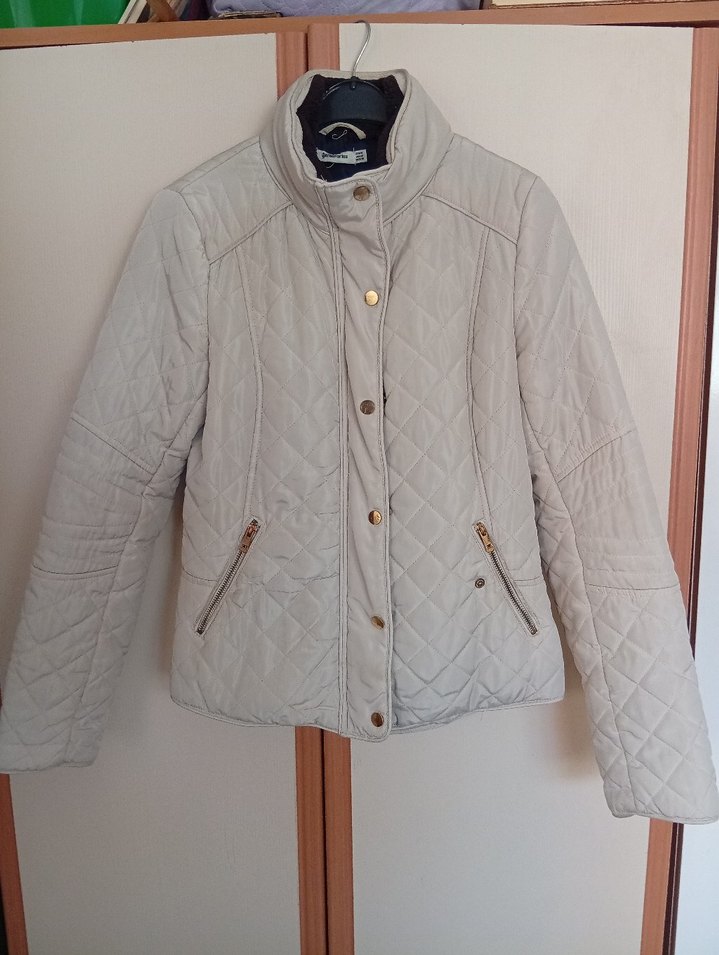 Bej renkte, düğmeli kısa kadın montu . Uzun kollu ve kesimi rahat. Sentetik kumaştan, günlük ve sokak stiline uygun.Boy 57 cm.İki omuz arası 38 cm dir.Rengi krem renktir.