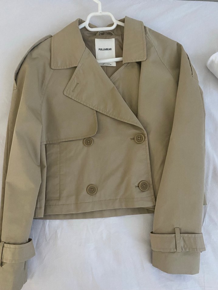 Bej renkli, düğmeli kısa trençkot, notched yakalı ve uzun kolludur. Yumuşak sentetik kumaştan yapılmış, günlük rahat kullanım için uygundur.