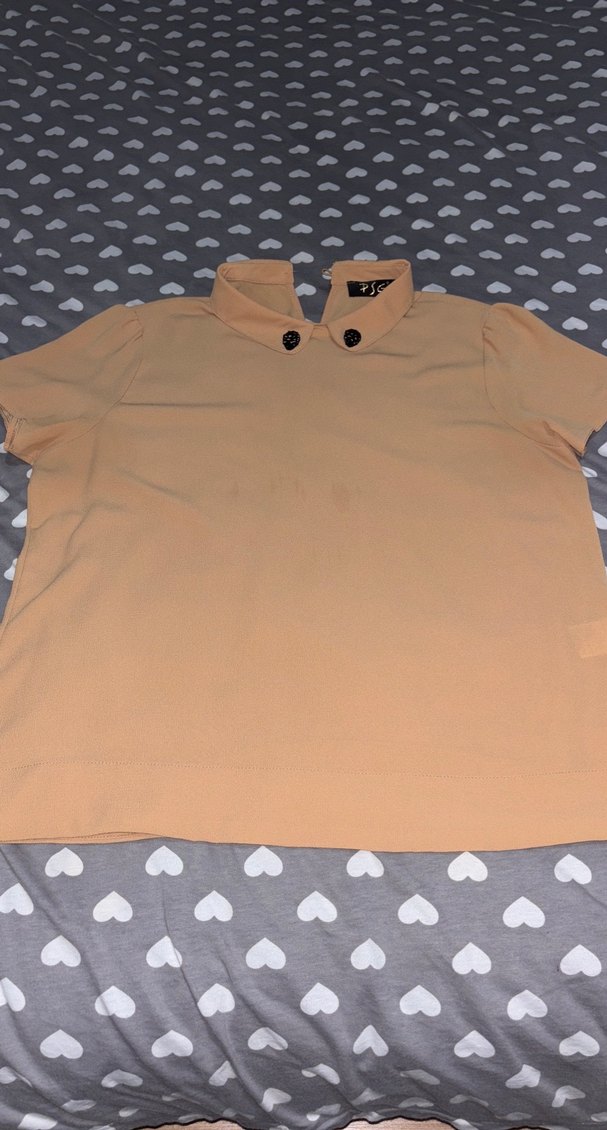 Bej renkli, kısa kollu, düğmeli yakalı ve bol kesimli kadın gömleği. Yumuşak sentetik kumaştan üretilmiştir, günlük rahat kullanım için uygundur.