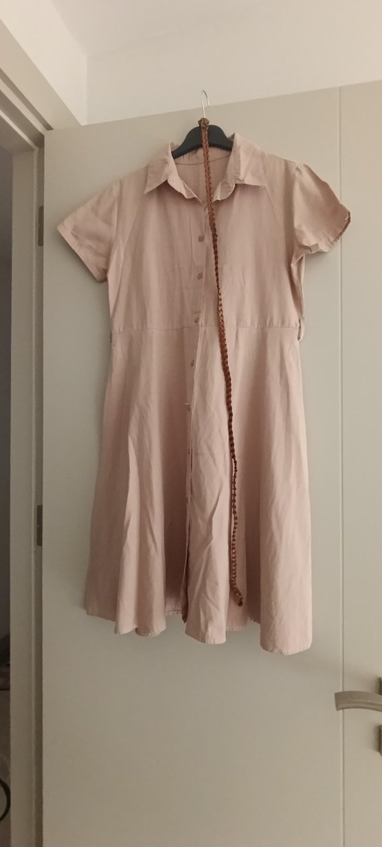 Bej renkli, düğmeli önü ve kısa kollu, yakalı midi elbise. Rahat kesimi ve yumuşak keten kumaşıyla günlük kullanıma uygun minimalist bohem tarzda.
