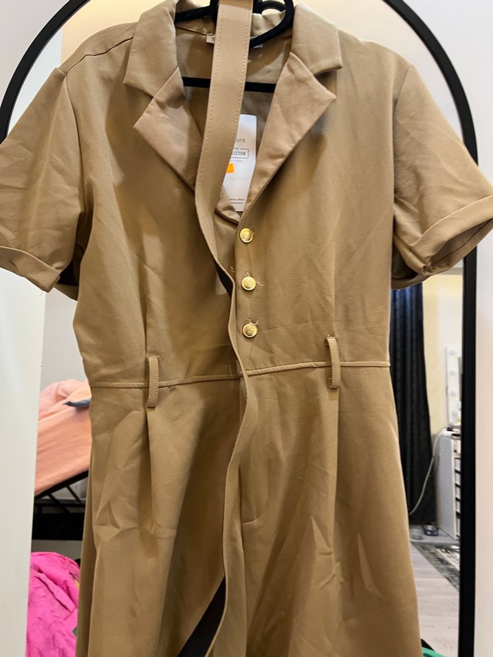 Düğmeli, kısa kollu, bej midi tulum. Notlu yakası ve parlak sentetik kumaşıyla ofis ve günlük kullanıma uygun. ✨