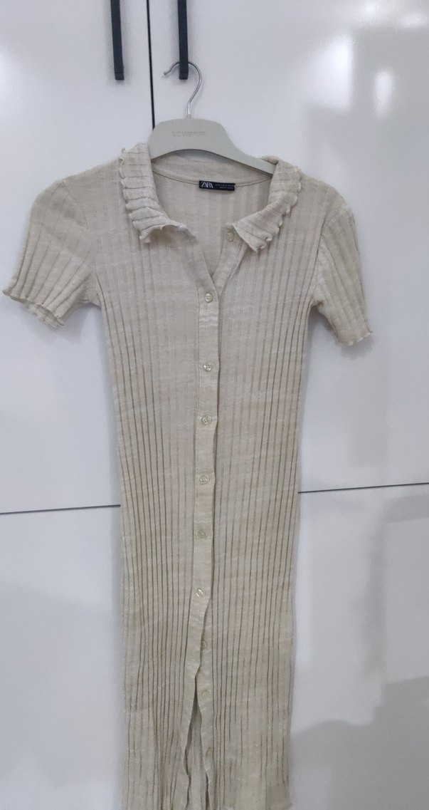 Bej renkli, kısa kollu ve uzun kesimli bu dar kesim elbise düğmeli ve yakalıdır. Günlük sokak tarzına uygundur.
