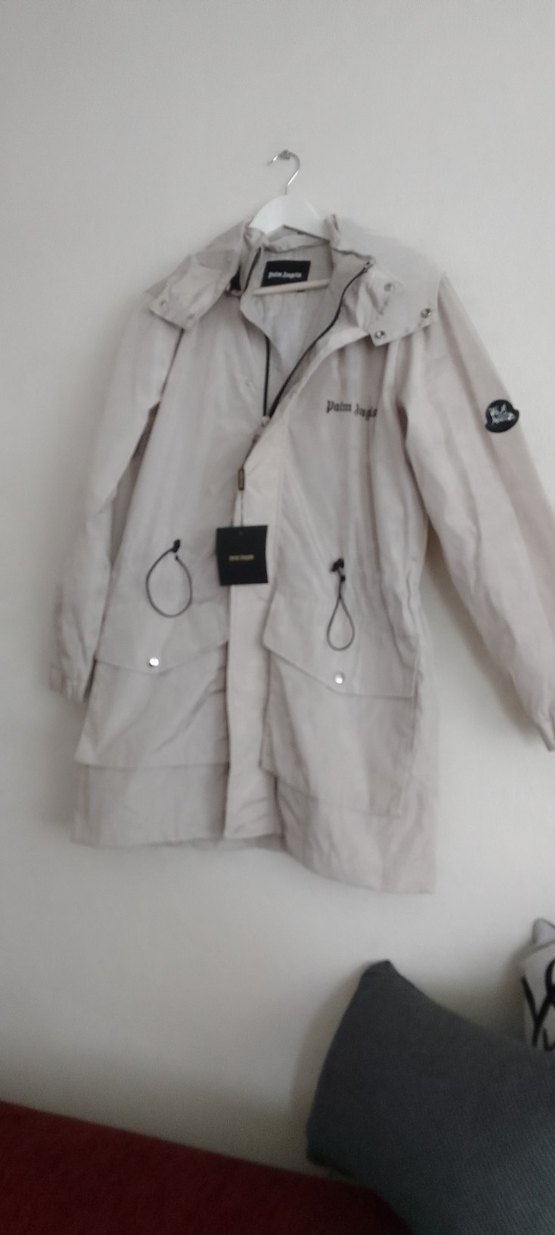Bej renkli, kısa kesim kadın ceketi uzun kollu, düğmeli ve notched yakalıdır. Sentetik kumaştan yapılmış, rahat kesimi ve baskılı detaylarıyla sokak stiline uygundur.