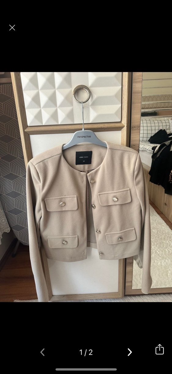 Bej renkli süet kumaştan yapılmış, düğmeli kısa kadın ceketi. Uzun kollu ve normal kesim, günlük sokak stili için uygundur.