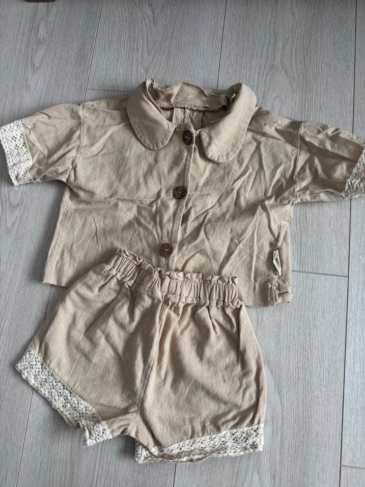 Bej renkli, düğmeli kısa kollu üst ve lastikli bel kısmı dantelli şortlu keten kız bebek takımı.