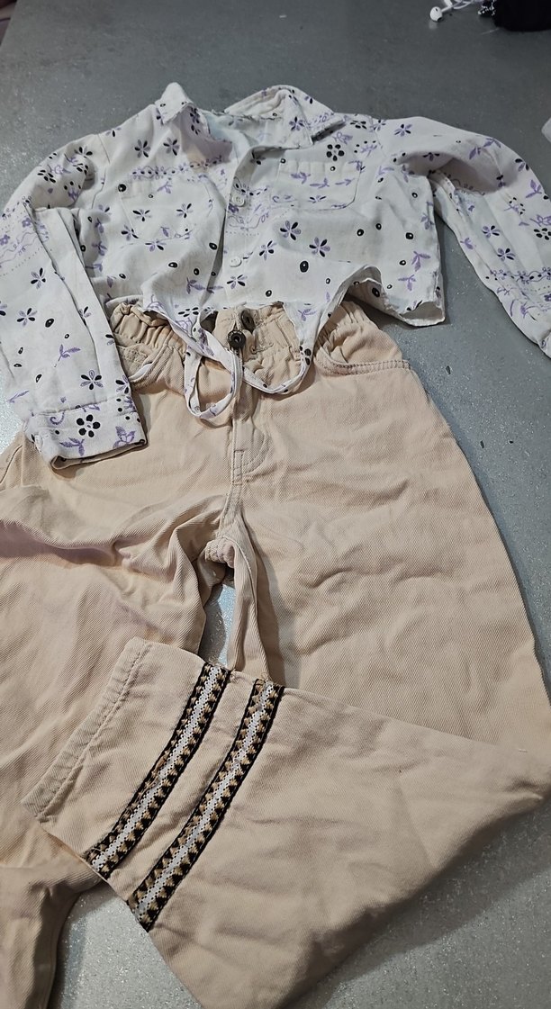 Bej renkli, düğmeli ve bol kesim kız çocuk pantolonu. Paça kısmında dekoratif çizgiler bulunur. Rahat ve günlük kullanım için uygun.