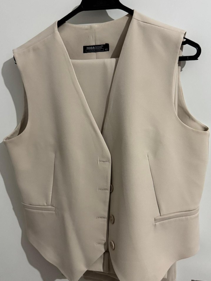 Düğmeli, bej renkli, klasik kesim ve yakalı kadın yeleği. Sentetik kumaştan, ofis kullanımı için uygundur.