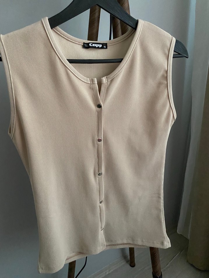 Düğmeli ve yuvarlak yaka bej kolsuz bluz, yumuşak keten kumaştan. Vücuda oturan kesimi ve normal boyu ile günlük sokak stiline uygun.