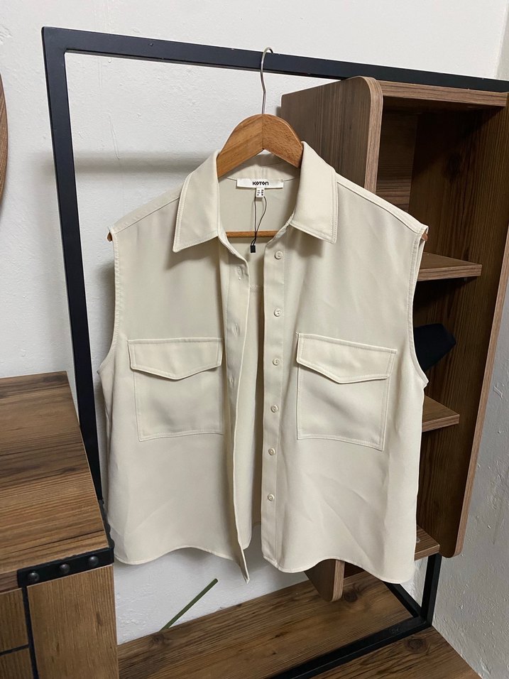 Bej Düğmeli Kolsuz Kadın Gömlek