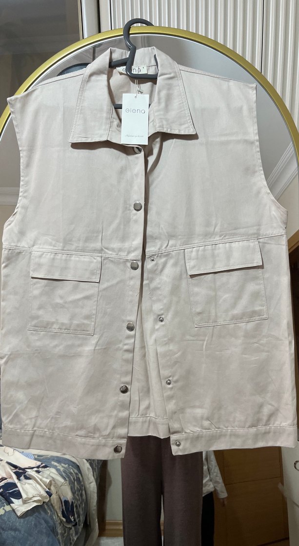 Bej renkli, düğmeli, kolsuz kadın yelek. Keten kumaştan, normal kesim ve midi boyda, günlük rahat sokak stili için uygundur.