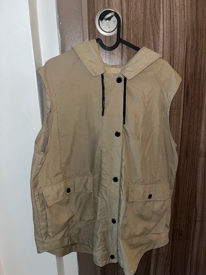 Kolsuz, düğmeli ve bol kesim olan bej yelek,cep detaylarına sahiptir, günlük kullanıma uygundur. İki defa giyildi