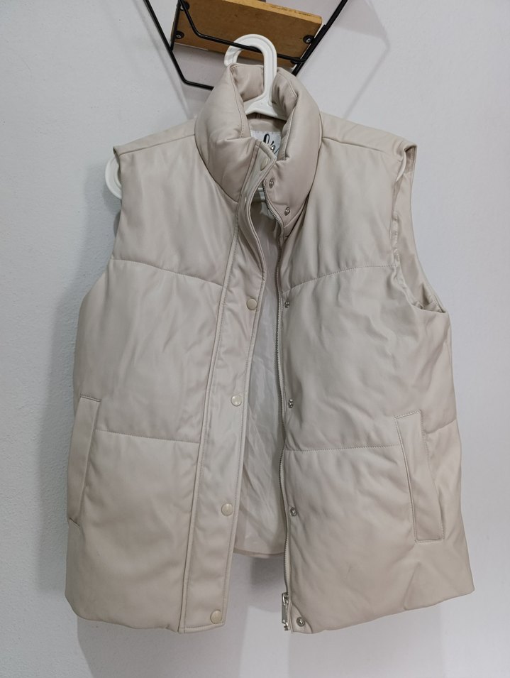 Bej renkte, yüksek yakalı ve düğmeli kolsuz yelek. Düz ve kısa kesim, rahat sokak stiline uygun sentetik kumaştan üretilmiştir.