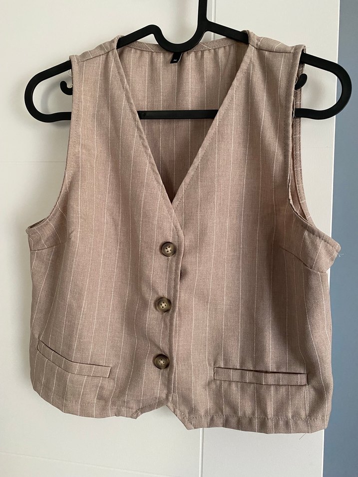 Bej renkli, keten kumaştan, kolsuz ve düğmeli yelek. Notlu yakaya sahip, normal uzunlukta ve rahat kesimlidir. Günlük sokak modasına uygundur.