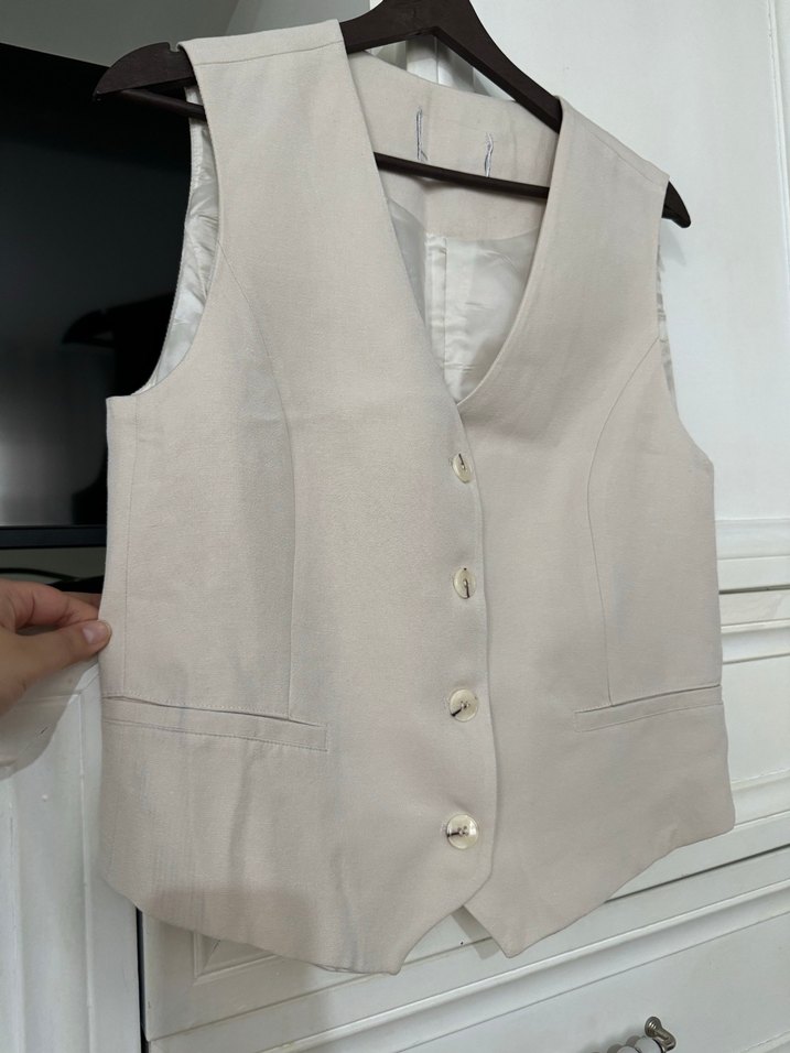 Bej renkte, düğmeli ve kolsuz hamile ceketi. Normal kesim, midi boyda ve sentetik kumaştan üretilmiştir. Ofis için uygun, desensiz tasarım.