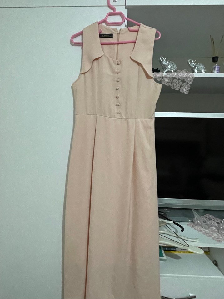 Bej Düğmeli Kolsuz Uzun Keten Elbise