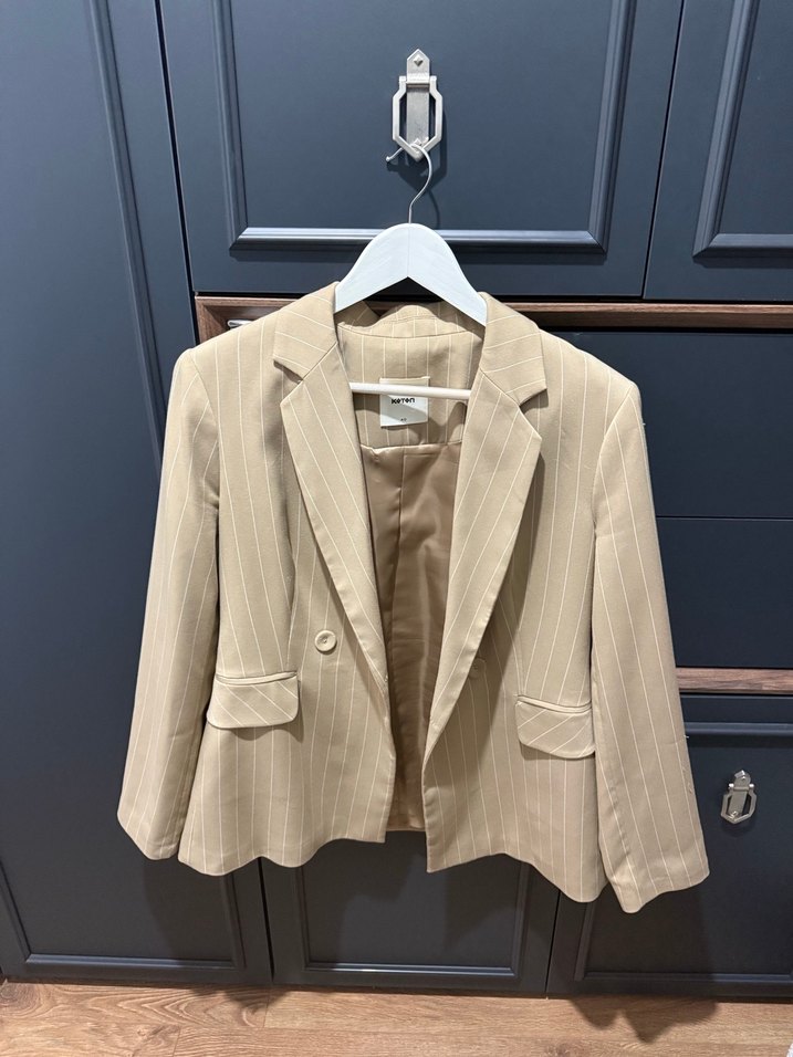 Bej renginde,düğmeli ve kısa kesim kadın blazer ceket. Notlu yaka ve hafif çizgili deseniyle ofis ve günlük kullanıma uygundur. Marka koton