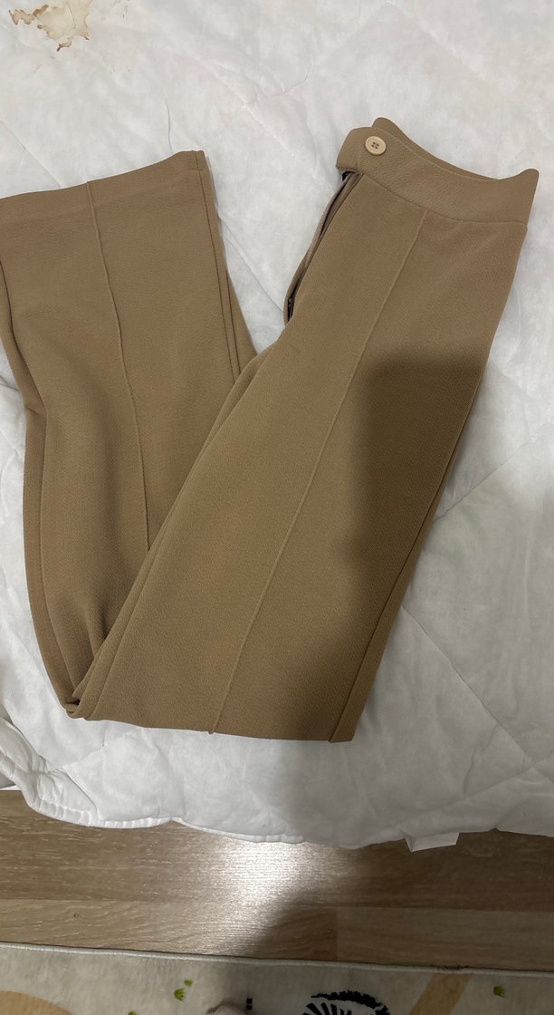 Bej renkte, düğmeli detaylı ve düz desensiz sentetik kumaştan yapılmış normal kesim pantolon. Ofis için minimal tarzda uygundur.