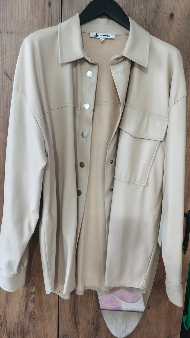 Bej renkte, düğmeli ve midi boy deri kadın ceket. Normal kesim, uzun kollu ve yakası kesimli. Sokak modasına uygun, günlük kullanım için idealdir.