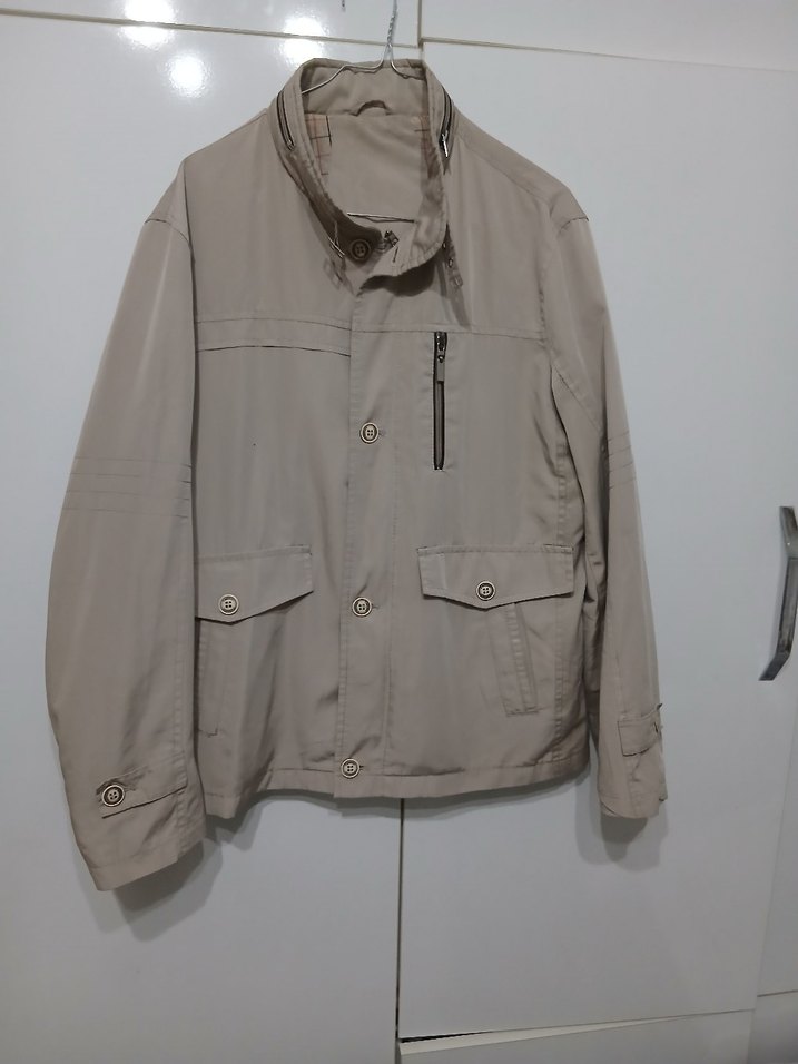 Bej renkte, düğmeli ve cep detaylı erkek ceket. Uzun kollu, normal boy ve bol kesimdir. Sentetik kumaştan üretilmiştir. nokta gibi kusuru vardır resimlerde var başka sorun yoktur