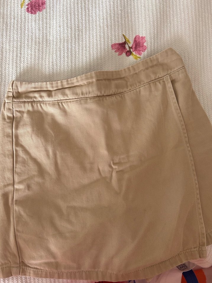 Bej renkli, düğmeli ve midi boy hamile eteği. Sentetik kumaştan, rahat ve günlük kullanıma uygun sokak stilinde bir parça.