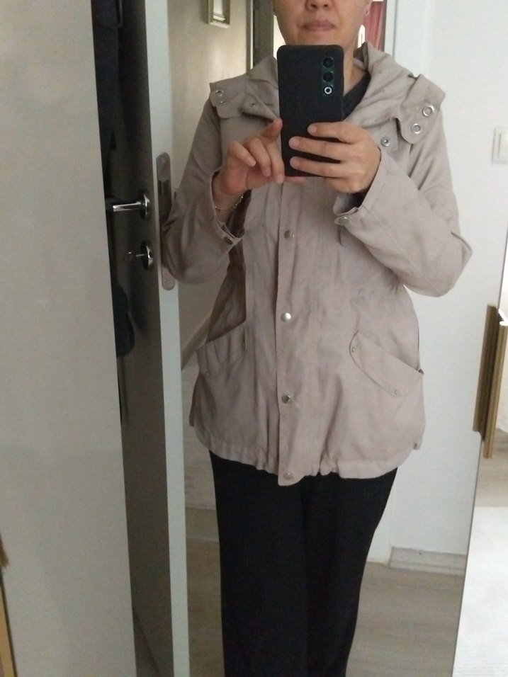 Bej renk, düğmeli, midi boy mont. rahat kesim, uzun kollu ve yakalı, günlük kullanım için uygun.fermuar kısmında küçük bir kusuru var ama kapanıyor fotolardada mevcut