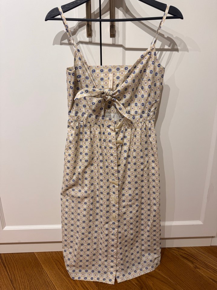 İnce askılı, düğmeli ön ve bağlamalı detaylı, vücuda oturan midi boy elbise. Yumuşak sentetik kumaştan yapılmış, pastel bej tie-dye desenli, romantik akşamlar için uygun.