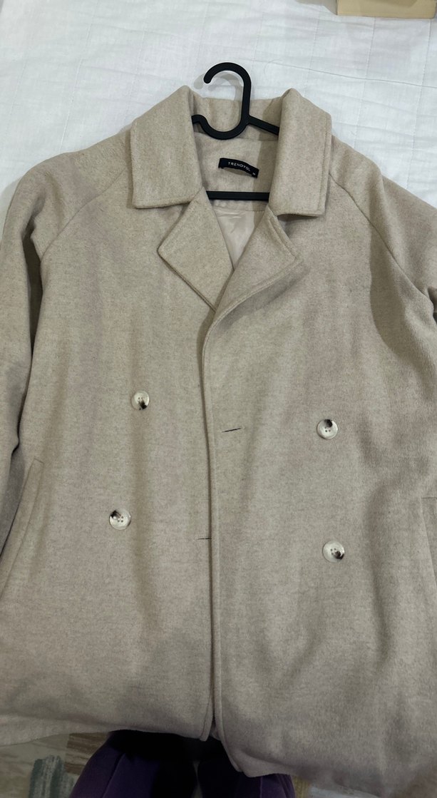 Bej renkli, düğmeli kaban, keten kumaştan. Normal kesim, uzun kollu, günlük kullanım için uygun. S bedene de olur.
