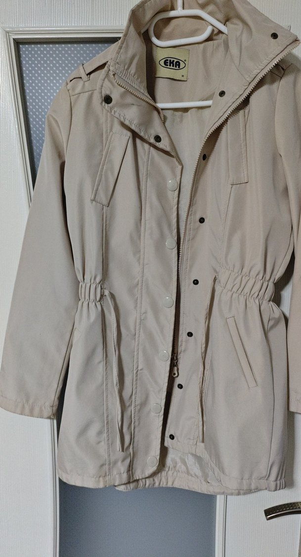 Bej renk, düğmeli midi uzunlukta, oturan kesim Notlu yaka ve uzun kollu, minimalist ve günlük kullanıma uygun. Sentetik kumaştan, sokak modası tarzında.