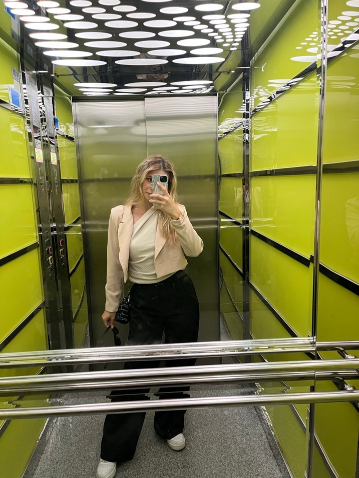 Bej renkli, düğmeli, crop Blazer ceket. Dar kalıp