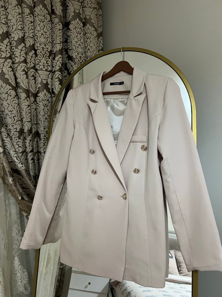 Bej renkte, düğmeli ön kapamalı, uzun kollu midi uzunluğunda kadın blazer ceket. Düz ve sentetik kumaştan, ofis ve günlük kullanıma uygun rahat kesim.