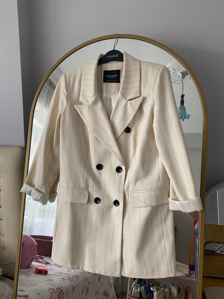 Bej renginde, düğmeli, uzun kollu ve normal uzunlukta kadın blazer ceket. Notlu yaka ve hafif desenli, ofis için uygun midi kesim.