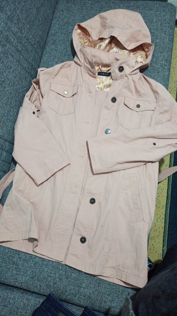 Bej pamuk kumaştan, düğmeli, uzun kollu, notched lapel yakalı, midi boy, salaş kesim kadın ceket. Günlük rahat stil için uygun, pastel tonlarda ve desensiz.