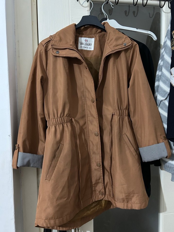 Bej renk, düğmeli, notched lapel yakalı, uzun kollu, bol kesim midi kadın ceket. Günlük kullanım için uygun, parlak görünümlü. Etek kısmında çok ufak bir delik var ama günlük kullanımda belli olmuyor.