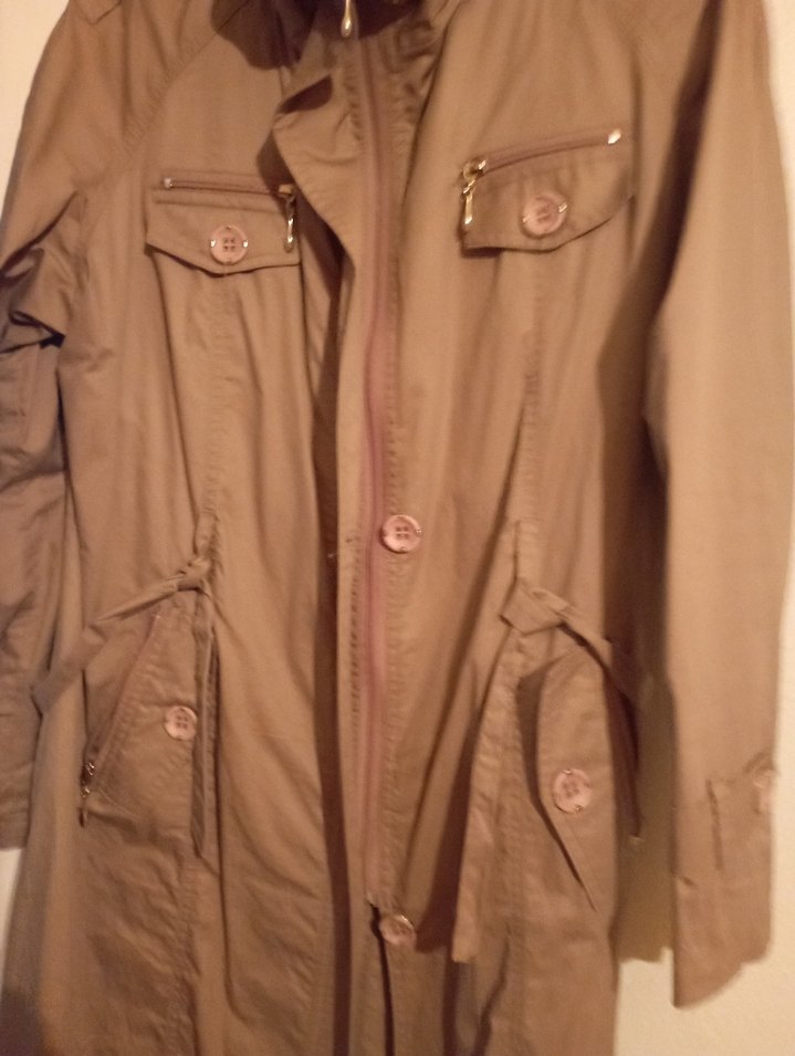 Bej renkli, düğmeli midi uzunlukta kadın ceket. Notlu yaka ve uzun kollu, düz desenli, sentetik kumaştan, günlük kullanıma uygun şık bir sokak stili ceket.