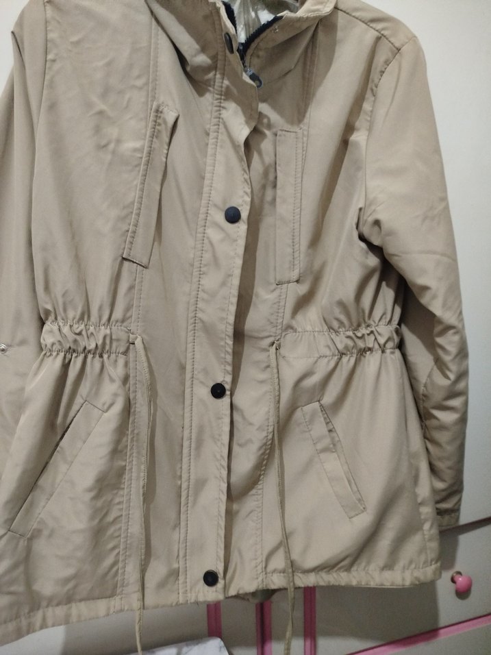 Düğmeli, uzun kollu, bej midi kadın ceket. Rahat kesim, kruvaze yaka ve belde ayarlanabilir ip detaylıdır. Günlük sokak tarzı için uygundur.