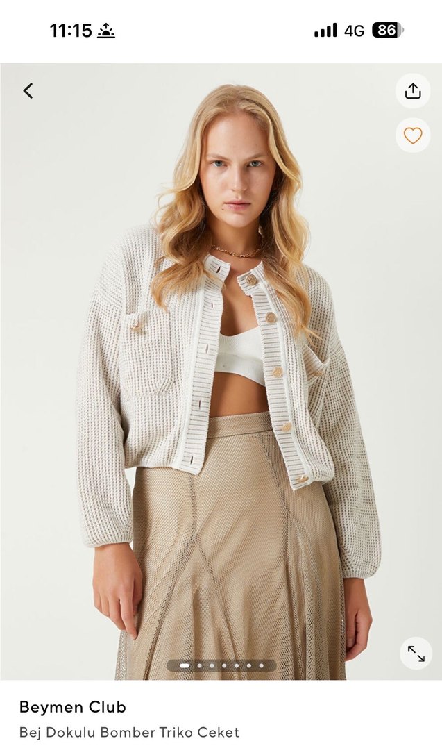 Bej renkli, düğmeli, uzun kollu, notlu yaka ve normal midi uzunlukta, bol kesim örme kadın hırkası. Günlük rahat kullanım için uygundur.
