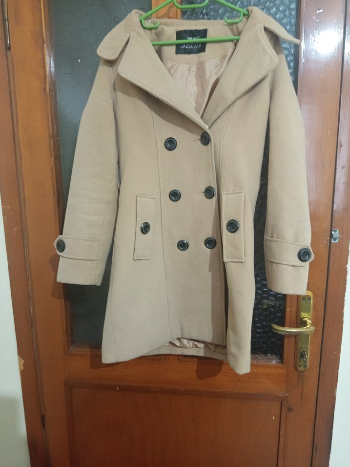 Yumuşak kürk kumaştan bej düğmeli midi kaban, notalı yakalı ve uzun kolludur. Günlük kullanıma uygun, rahat kesimdir.