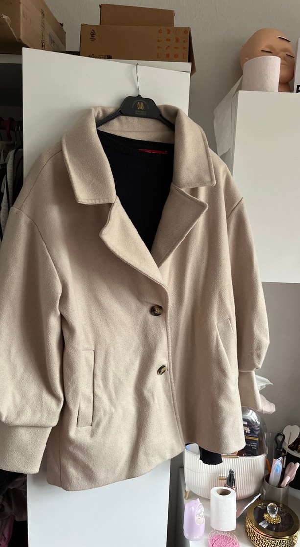 Bej renkte, düğmeli ve yaka detaylı, yumuşak kumaştan midi boy kadın kaban. Salaş kesimi ve uzun kolludur, günlük kullanıma uygundur.