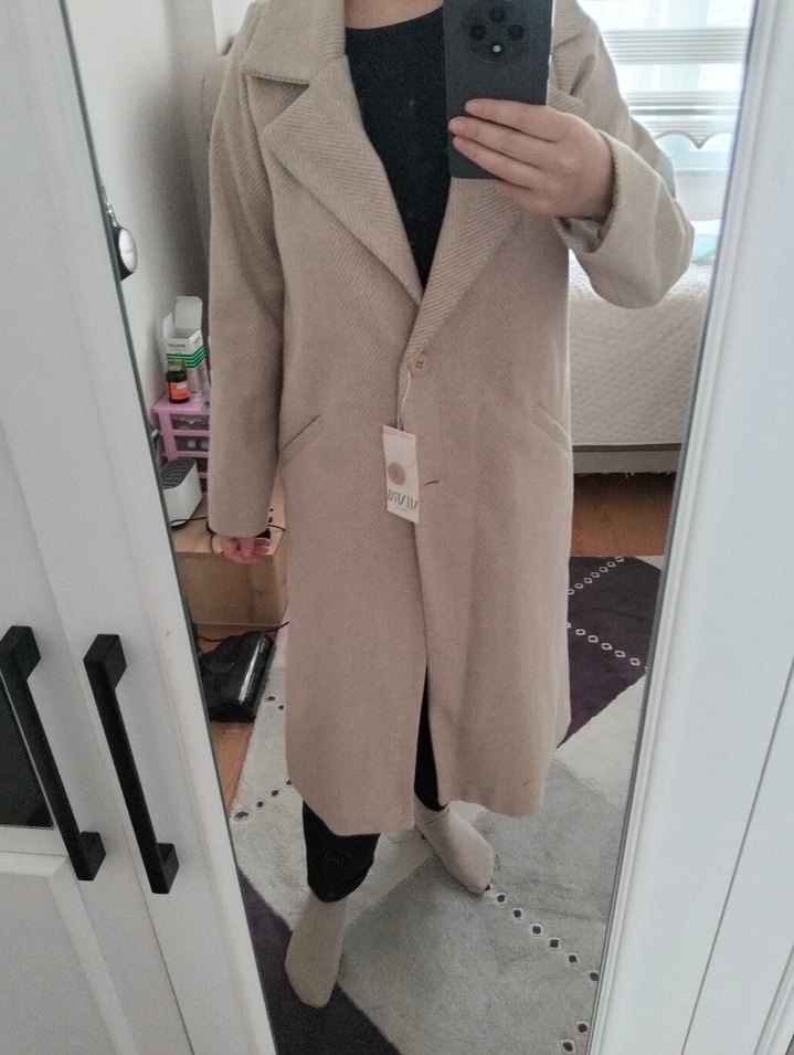 Bej renkli, düğmeli, uzun kollu, gevşek kesim midi kadın kaban. Notlu yaka detayına sahip, yumuşak ve sıcak kumaştan üretilmiştir. m bedenr de olur