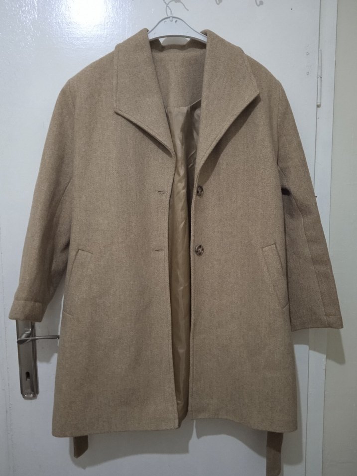 Bej renkte, düğmeli ve yün kumaştan üretilmiş, klasik yaka detaylı midi uzunlukta kadın kaban. Günlük kullanıma uygun, rahat kesim ve uzun kollu.