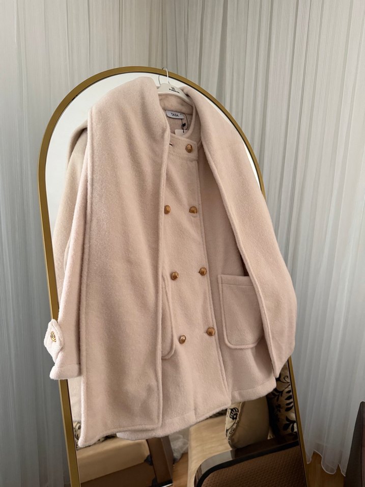 Bej renkli, düğmeli ve notalı yakalı kadın kabanıdır. Yumuşak ve sıcak kumaştan yapılmış, uzun kollu ve midi boydadır. Günlük kullanıma uygundur.