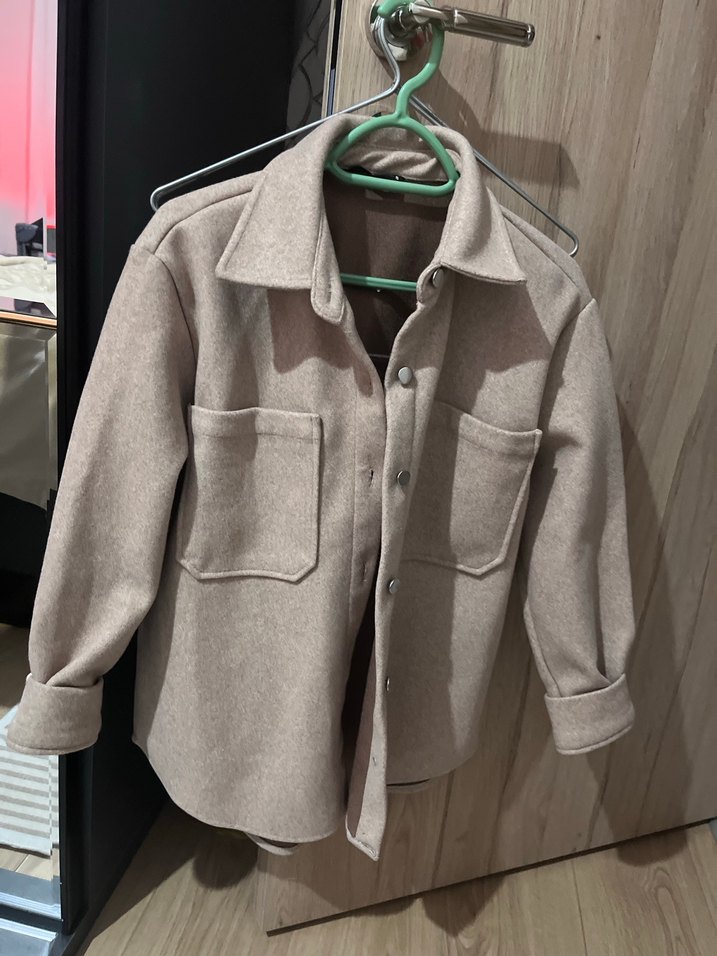 Bej renkte, düğmeli, yaka detaylı ve cep cepli yün kaban. Uzun kollu, rahat kesim ile günlük kullanım için uygun.