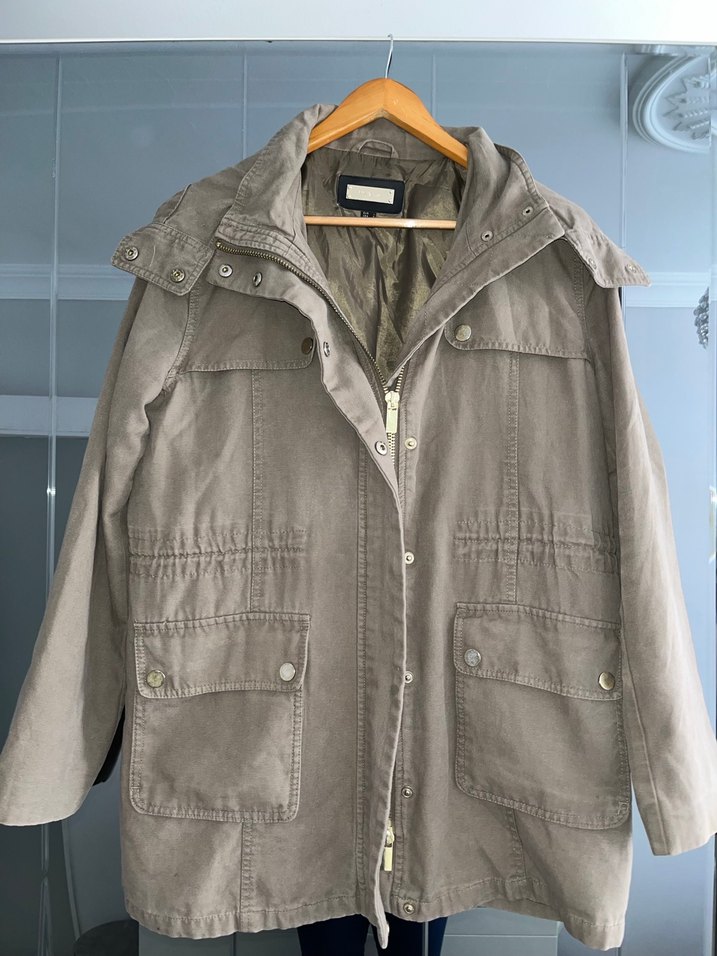 Bej keten kumaştan, düğmeli, normal boy, uzun kollu, salaş kesim kadın ceket. Rahat ve günlük kullanıma uygun bir modeldir.